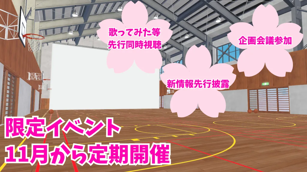 2025年11月より、バーチャル上のSPRIX学園体育館にてYouTubeチャンネル登録者限定のイベントを定期的に開催します。情報初披露や歌ってみたコンテンツの先行同時視聴など、日頃応援いただいているファンの方に向けて特別なコンテンツを提供するイベントとなります。